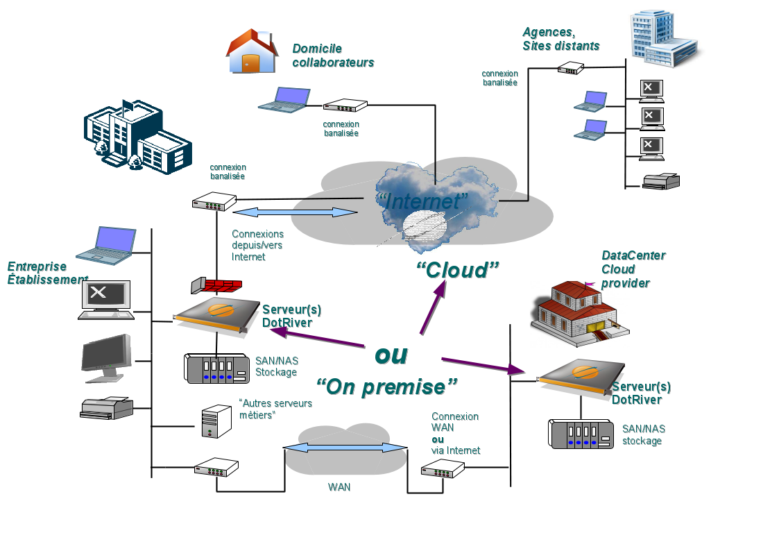 OfficeRiver : C'est tout DotRiver sur des serveurs dédiés à une organisation (possible en cluster). Hébergé en propre, par DotRiver, un tiers, sur une offre « cloud », OfficeRiver est supervisé et administré par nos soins.