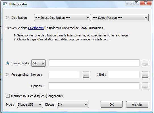 En bas de la fenêtre, choisissez “Disque USB” comme type et la lettre correspondant à votre clé USB (sous Windows, pour connaître la lettre associée à votre clé, rendez-vous dans “poste de travail” ou “ordinateur” en fonction de votre version).