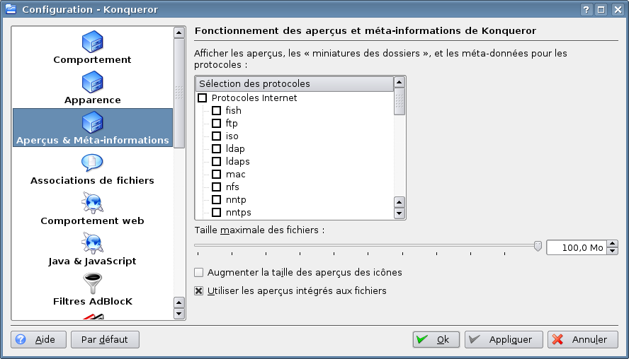 Il est possible que dans Konqueror certaines miniatures ne s'affichent pas.