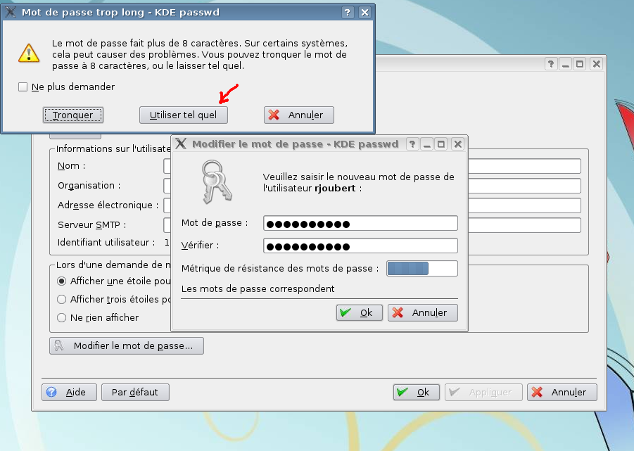 Puis saisir son nouveau mot de passe deux fois, valider en cliquant sur OK. Puis si une nouvelle fenêtre “Mot de passe trop long” s'ouvre, cliquer sur “Utiliser tel quel”.