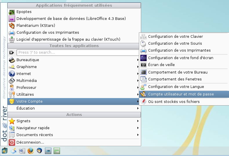 Cliquer sur l'icone DotRiver (généralement en bas à gauche), ce qui aura pour effet d'ouvrir la barre de menu. Aller dans “Votre compte” –> “Compte utilisateur et mot de passe”