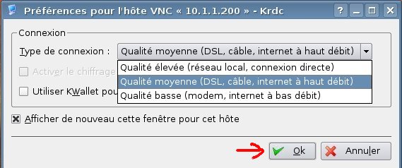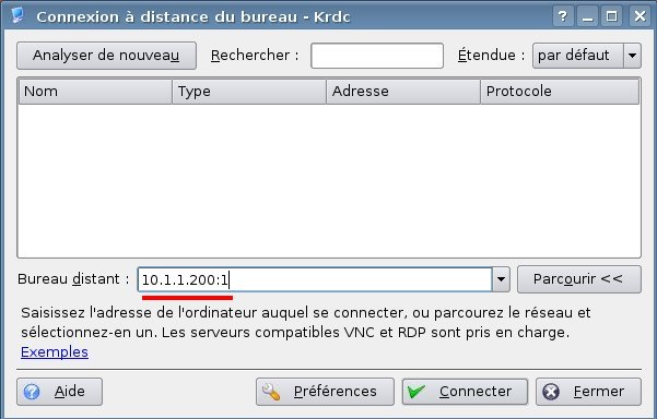 Pour se connecter au bureau de l'utilisateur A, l'utilisateur B lancera le programme qui se trouve dans Démarrer → Internet → Connexion à un bureau distant (Krdc).