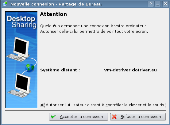 Avec Krfb/Krdc, vous pouvez être 2 utilisateurs DotRiver sur un seul et même écran (l'écran de l'utilisateur qui partage son bureau).